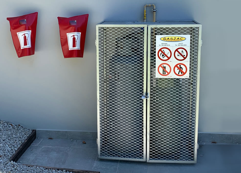 Outside we installed a gas cage and mounted a fire extinguisher.